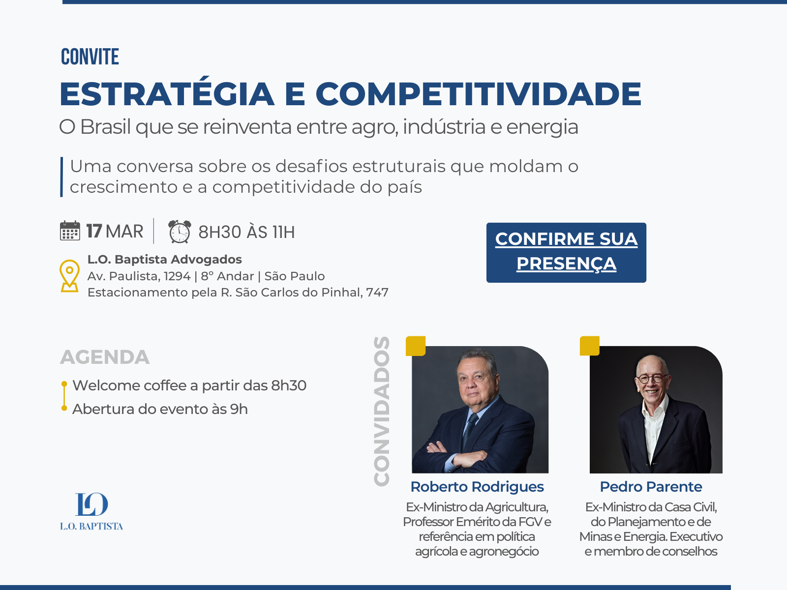 On March 17, the firm will have the pleasure of welcoming former Ministers Roberto Rodrigues and Pedro Parente for a conversation with a select group of clients and contacts. The discussion will offer reflections on Brazil’s development from the perspective of sectors that play a central role in the country’s competitiveness and economic agenda. The exchange is particularly relevant for companies and executives closely following the challenges and opportunities within the Brazilian economy.
